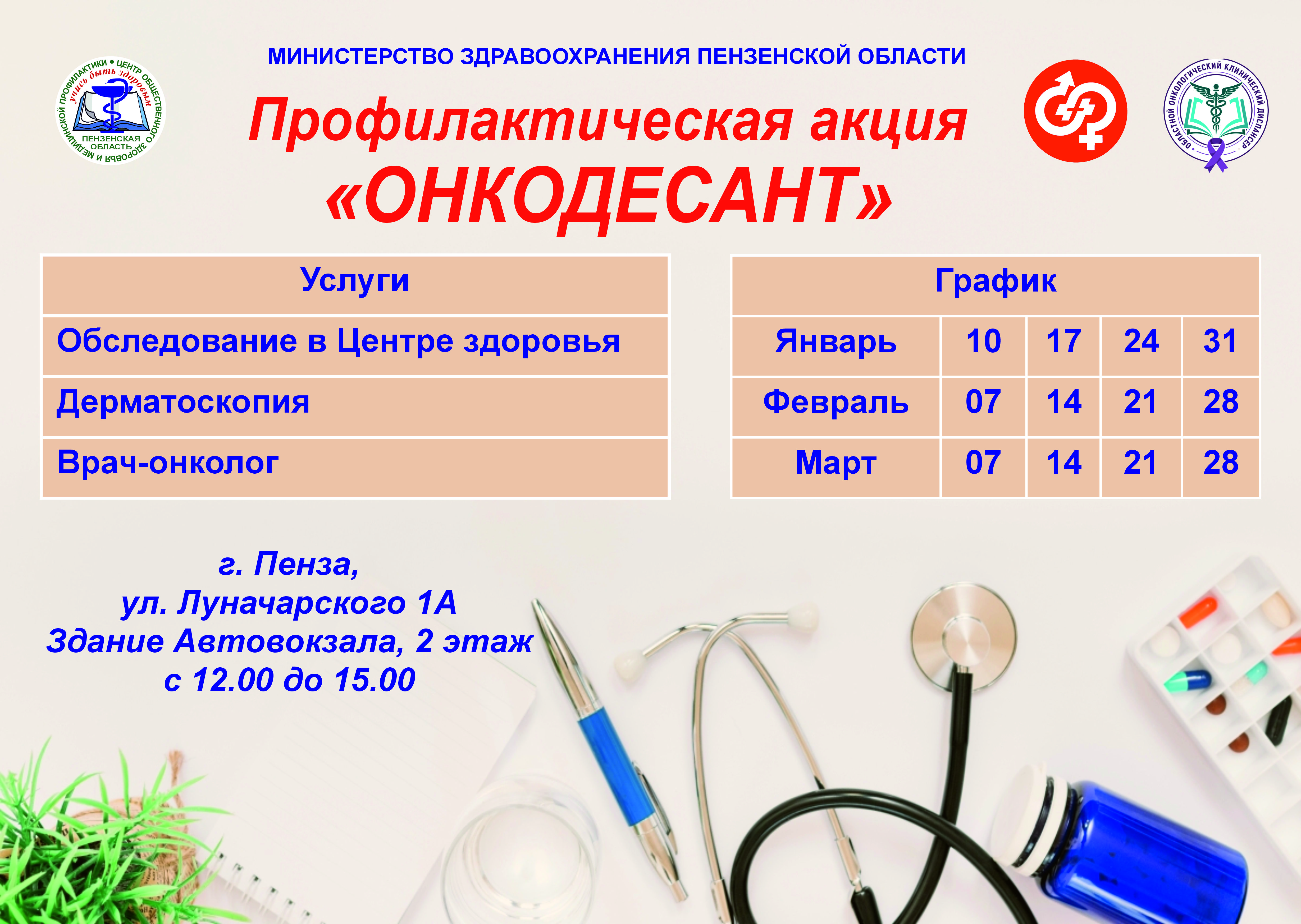 Здание пензенского Автовокзала по адресу г. Пенза, ул. Луначарского, 1, уже четвёртый год подряд станет местом ее проведения. В зале ожидания на 2-ом этаже каждый желающий сможет пройти комплексное обследование на площадке Центра здоровья, сделать дерматоскопию и получить консультацию врача- онколога.